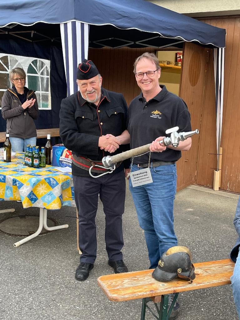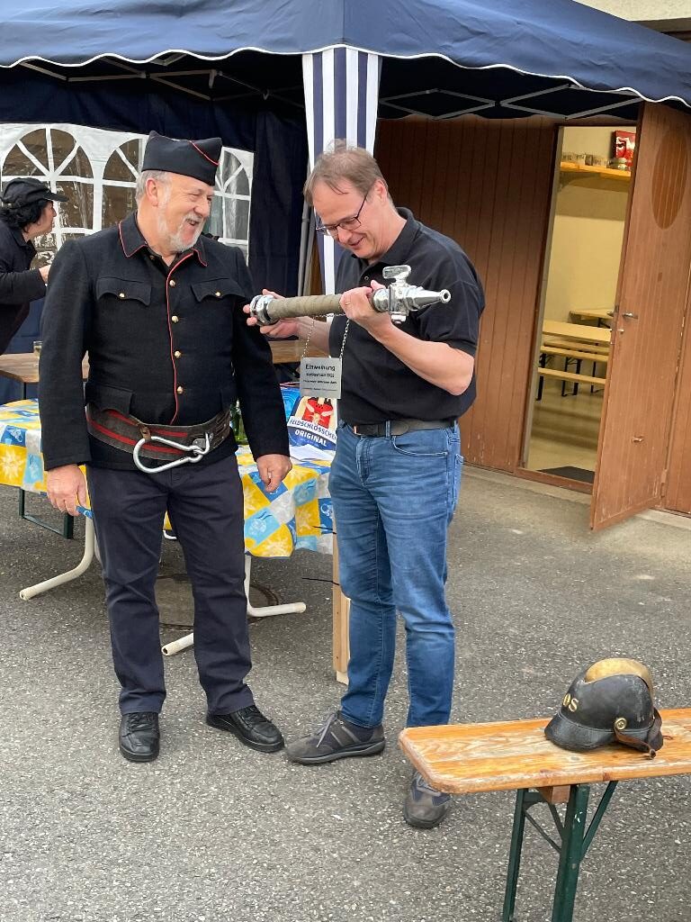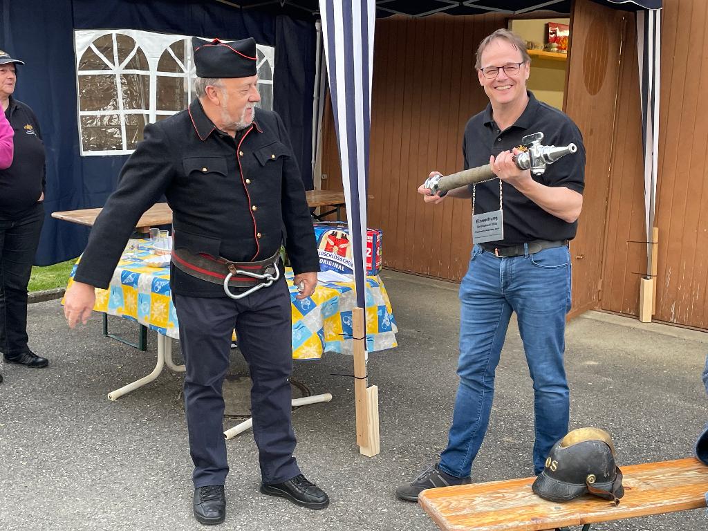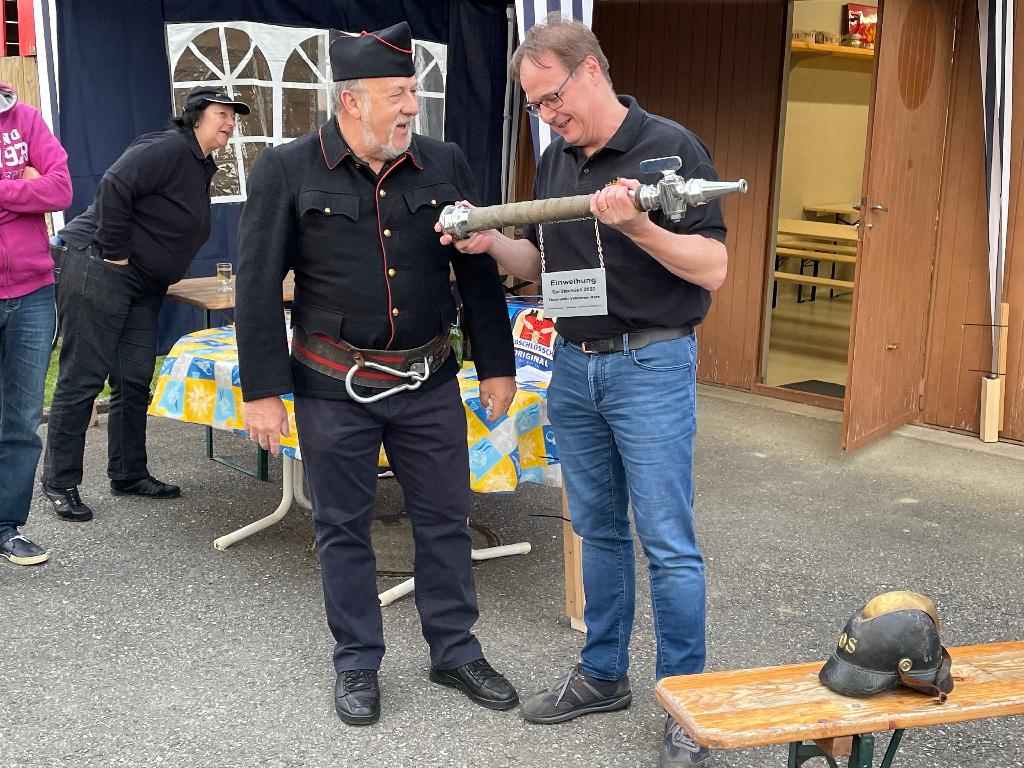 Zur Überraschung aller, überreichte der Uniformierte und mit dem Kleinst-TLF angereiste „Mösu“ dem Präsident ein Strahlrohr zur Einweihung. Danke „Mösu“!!!