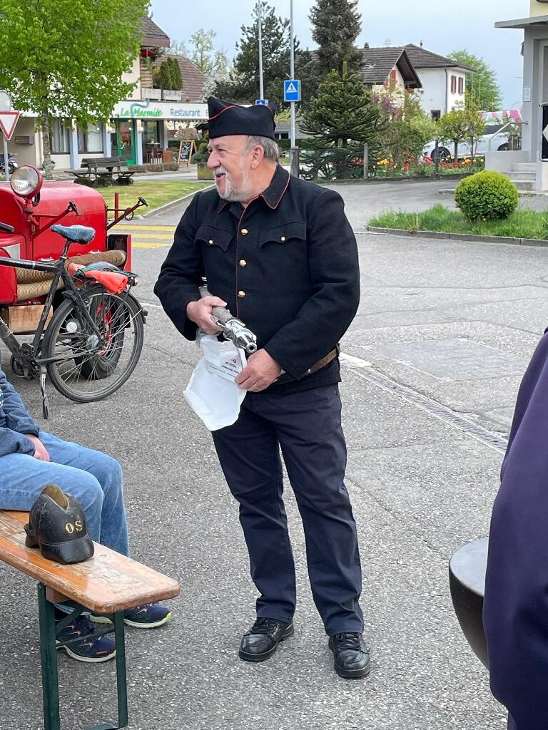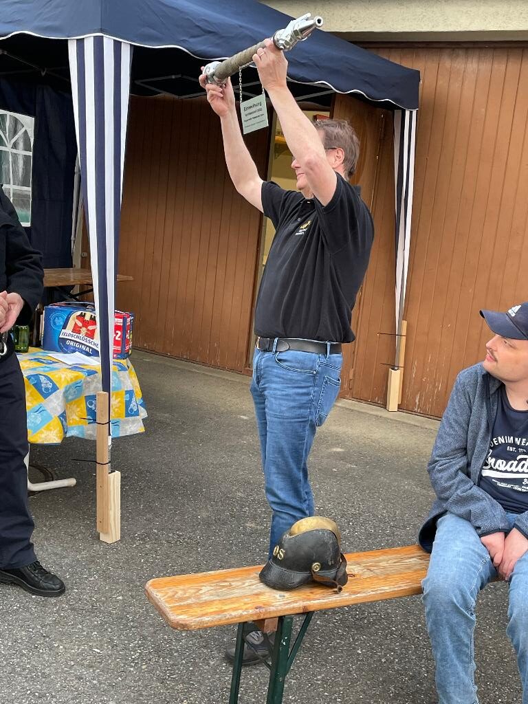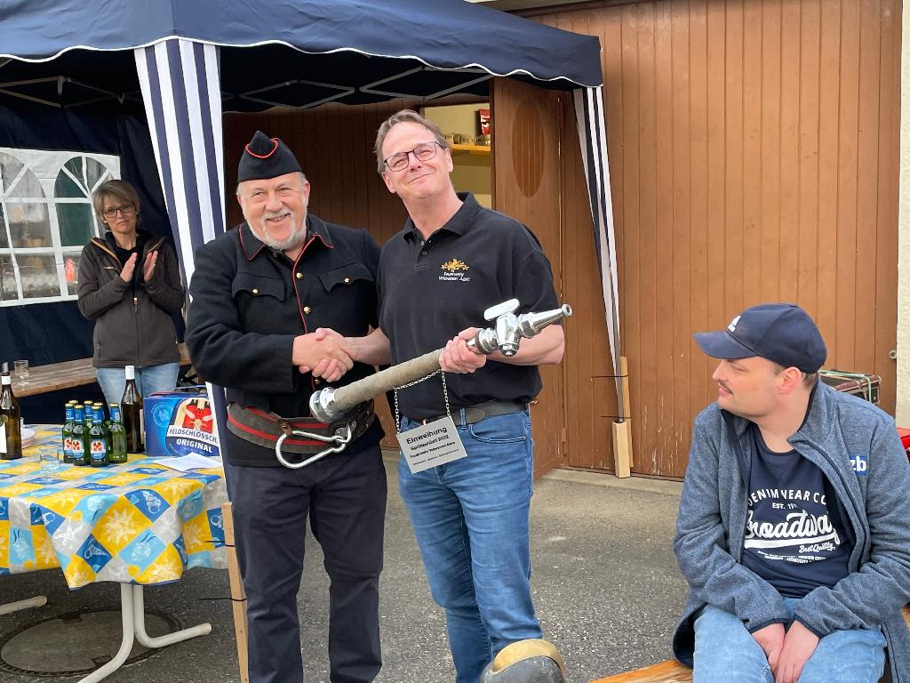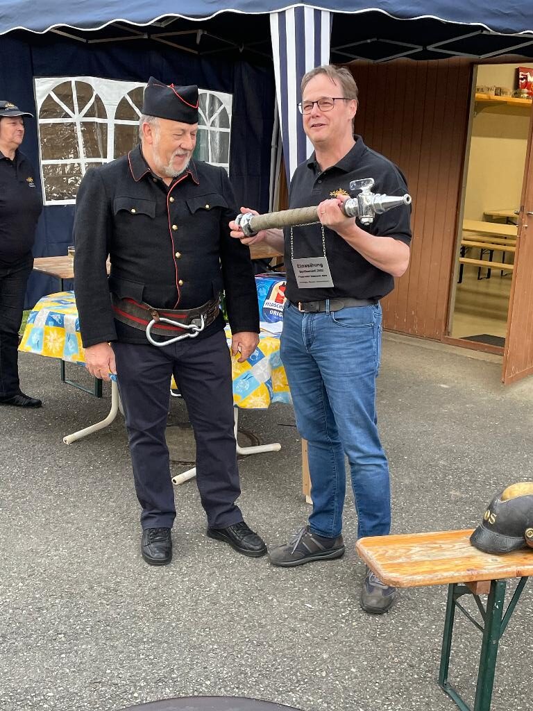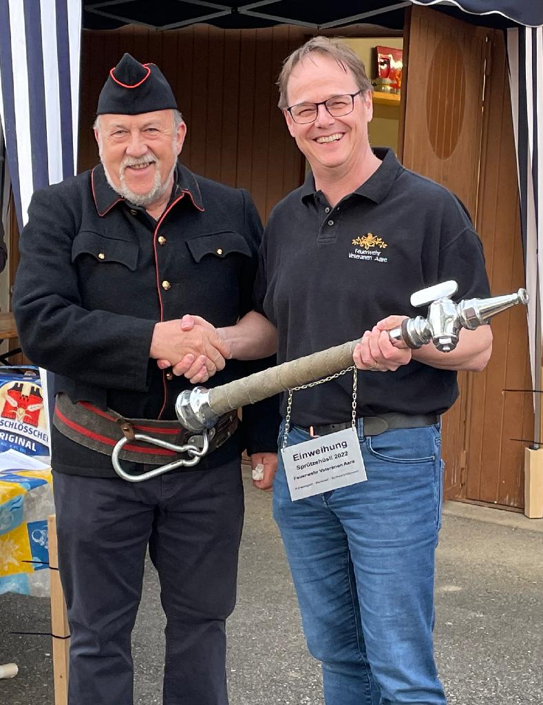 Zur Überraschung aller, überreichte der Uniformierte und mit dem Kleinst-TLF angereiste „Mösu“ dem Präsident ein Strahlrohr zur Einweihung. Danke „Mösu“!!!