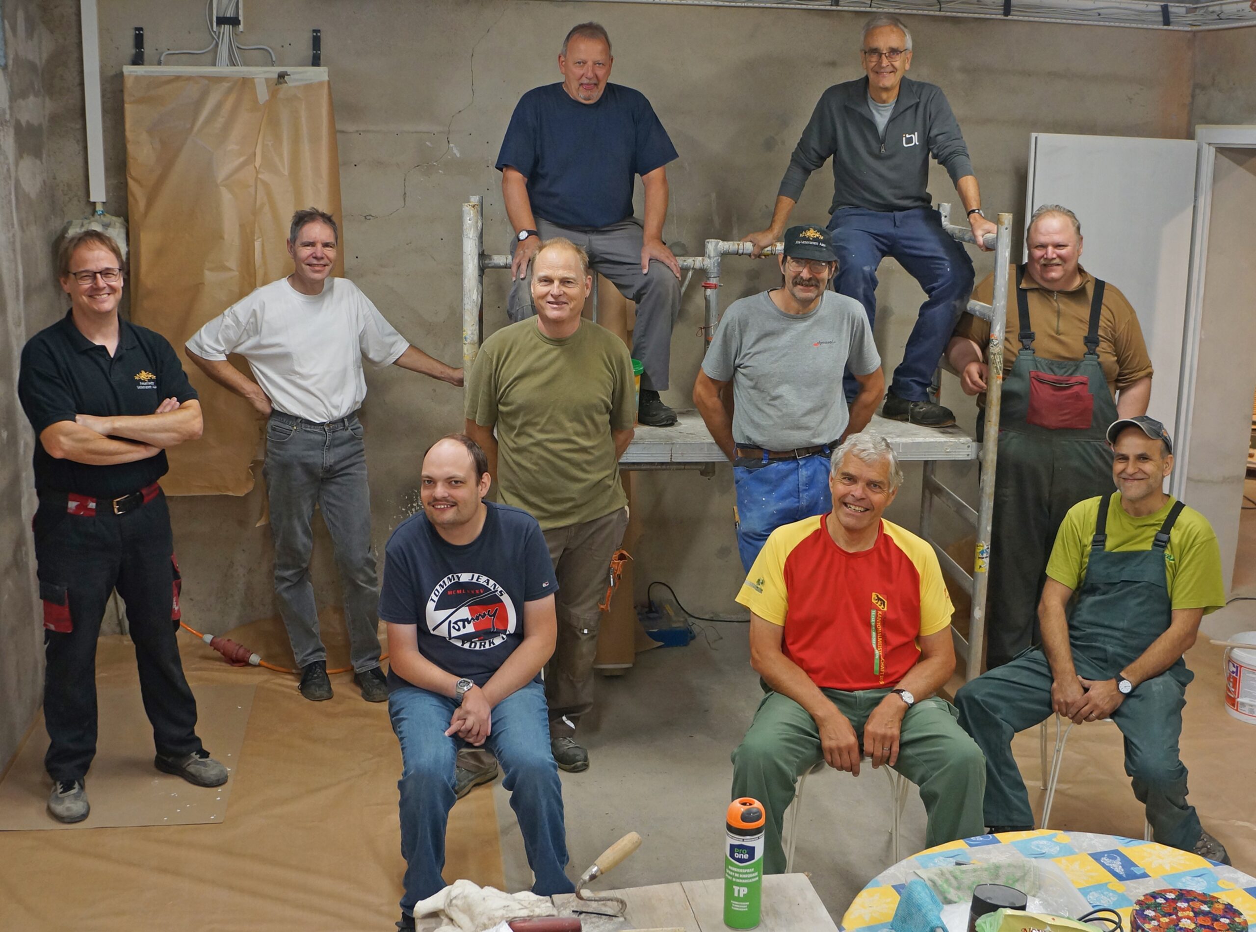 Bildlegende: Treffen sich nach coronabedingter Pause wieder jeden Samstagmorgen zur Renovation des alten Sprützehüsli Bannwil. Vorne, v.l.: Michael Grab, Martin Hilpert, Urs Berchtold. Mitte, v.l.: Markus Grab, Bruno Abt, René Lindemann, Heinz Greub, Urs Meyer. Hinten, v.l.: Marcel Pulver, Hanspeter Bögli. (Bild: Jessica Meier)